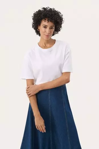 Jamina t-skjorte er en klassisk og behagelig T-skjorte laget av 100?% bomull, som gir naturlig mykhet, god pusteevne og komfort gjennom hele dagen. Denne t-skjorten i hvitt eller lyseblått er et allsidig basisplagg som enkelt kan styles med jeans, skjørt eller under jakker for en avslappet og tidløs look