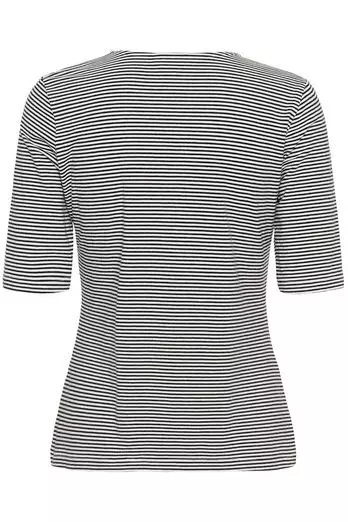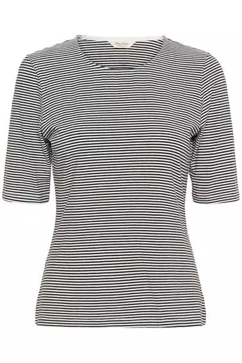 Denne deilige tskjorten med tynne blå striper er et tidløst basisplagg i myk bomullsblanding. T-skjorten har rund hals, korte ermer og en klassisk passform som gir god komfort hele dagen. Enkel å style med jeans, skjørt eller under blazer – perfekt til både hverdag og jobb.