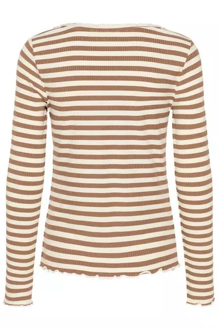 Denne ribbestrikkede genseren i brun nyanse kombinerer klassisk stripedesign med en varm og behagelig følelse mot huden. Med sin myke viskoseblanding på 95 % og 5 % elastan får du et plagg som faller elegant og gir en flatterende silhuett uten å miste komfort. Det ribbestrikkede mønsteret gir struktur og dybde til uttrykket, og stripene tilfører et tidløst visuell element som løfter antrekket.