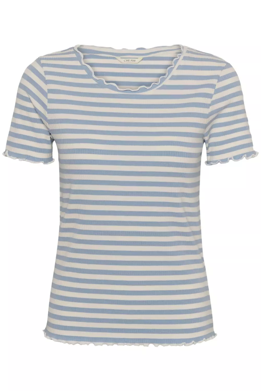 Oppdag vår Ribba T-skjorte i lyseblå stripete – den perfekte miks av sommerlig friskhet og tidløs design! Med ribbestrikket struktur og et delikat stripemønster gir denne t-skjorten et stilrent uttrykk til enhver outfit. Den lette og komfortable kvaliteten gjør den like behagelig til jeans som skjørt eller shorts, og materialblandingen gir både fleksibilitet og kvalitet. Et must-have plagg som løfter basisgarderoben.